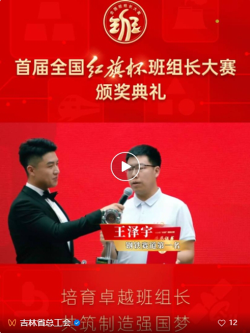 8月22日,《吉林省总工会》微信公众平台视频号发布报道《【荣耀时刻】钢铁赛道第一名——王泽宇,我会把这次大赛学习到的经验融入到生产工作中,为制造强国贡献力量》,对获得首届全国“红旗杯”班组长大赛钢铁赛道冠军王泽宇进行了现场采访。